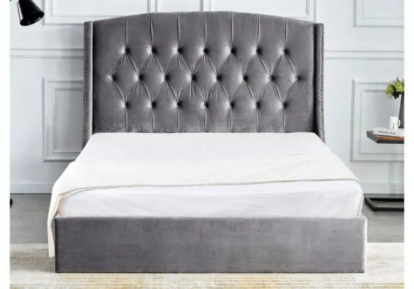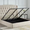 Le “Lit coffre capitonné velours beige Chester” est un lit de rangement élégant avec une téte de lit capitonnée en velours beige, offrant style et fonctionnalité.