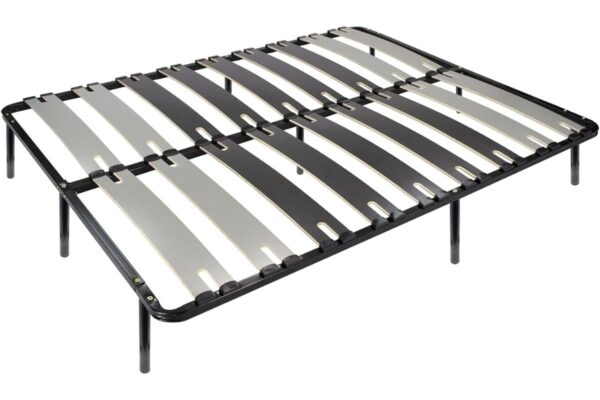Sur l’image que vous avez envoyée, on peut voir un sommier é lattes avec des lattes en bois. Le cadre du sommier est en métal. Les lattes sont espacées de maniére uniforme et sont fixées au cadre du sommier é l’aide d’embouts en plastique.