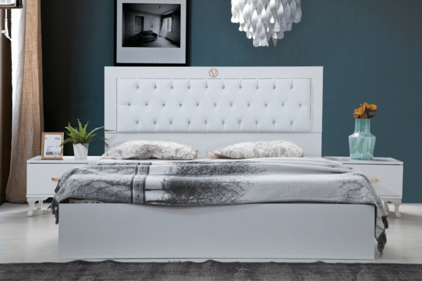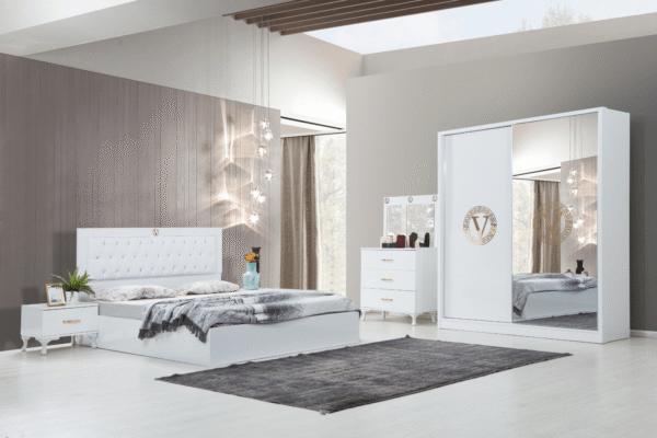 Illuminez votre chambre avec notre modèle complet NEW VERSACE composée d’un cadre de lit, d’une armoire, de deux chevets et d’une commode (avec miroir). Une chambre chaleureuse qui vous apportera confort et bien-être.