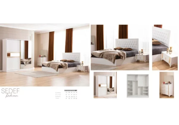 La chambre Sedef incarne l’élégance contemporaine grâce à son design épuré et ses éléments sophistiqués. Chaque meuble a été soigneusement sélectionné pour créer un espace qui allie confort et style. Du lit spacieux à l’armoire fonctionnelle, en passant par la coiffeuse raffinée et le chevet élégant, chaque pièce de cette chambre est conçue pour offrir une atmosphère sereine et moderne dans votre espace de vie.