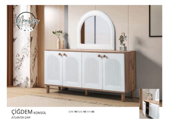 La console ÇİĞDEM en finition Atlantik Çam séduit par son design chaleureux et moderne, inspiré de l’esthétique naturelle du bois. Avec ses lignes élégantes et sa teinte bois Atlantik, elle apporte une touche d’authenticité et de sophistication à votre espace de vie.
