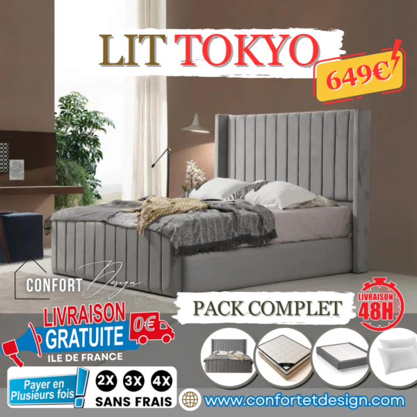 - Lit Tokyo : Design chic et tendance, tête de lit capitonnée, revêtement en velours haut de gamme, fabrication traditionnelle.
