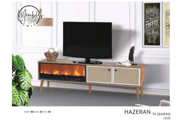 Le meuble TV Hazeran est un meuble TV design moderne en panneaux mélaminés, souvent présenté dans une finition chêne naturel avec pieds métalliques. Il est conçu pour être fonctionnel et esthétique, avec rangement pour appareils multimédia et une surface stable pour la TV. Emob Meubles+1