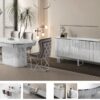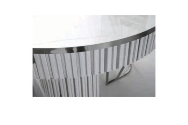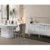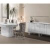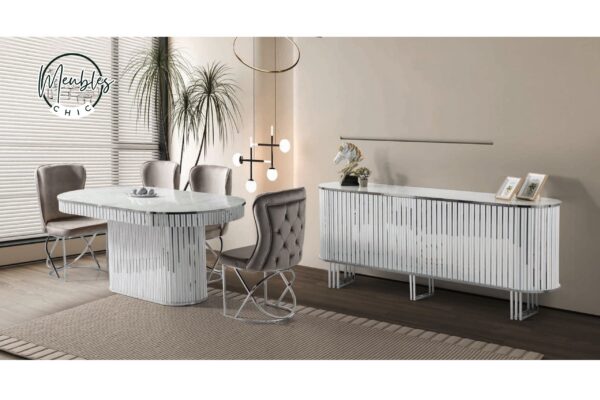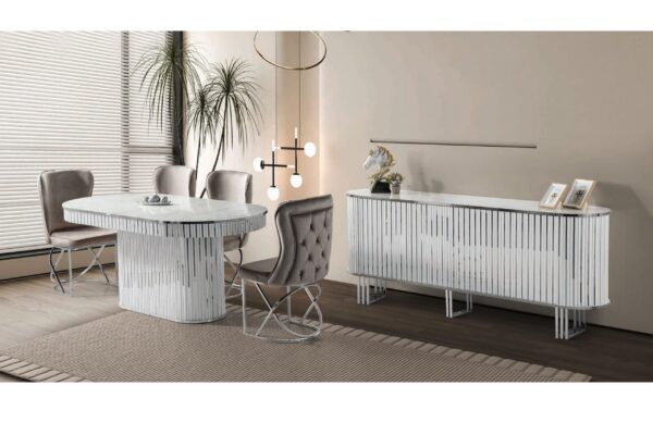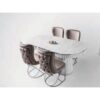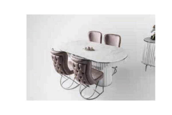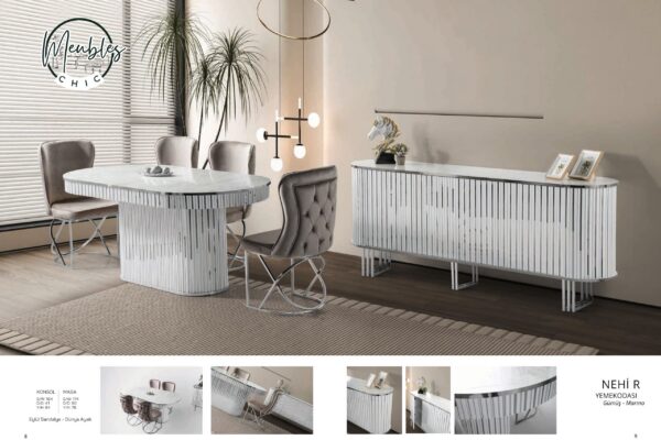 La salle à manger Nehir Gümüş – Marmo offre un design moderne et épuré, sublimé par une élégante finition argentée. Son plateau effet marbre Marmo apporte une touche lumineuse et contemporaine, idéale pour un intérieur raffiné.