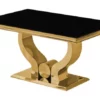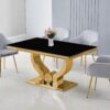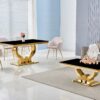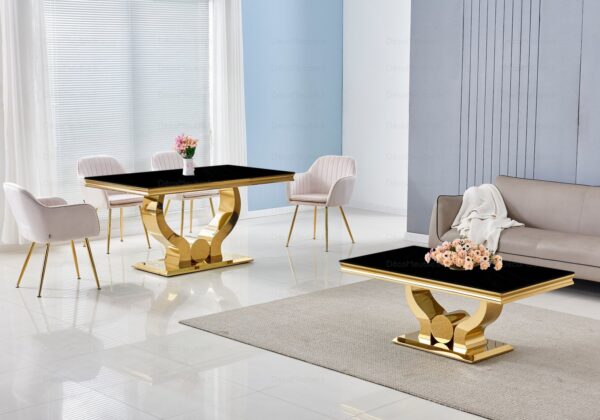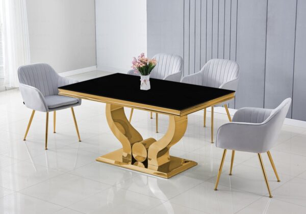 Transformez votre salle à manger en un espace élégant et contemporain avec l’ensemble NEA, composé d’une table en verre noir et de chaises dorées. Ce design raffiné apporte une touche moderne et sophistiquée à votre intérieur. Profitez d’un excellent rapport qualité/prix pour partager des moments inoubliables autour de votre table.